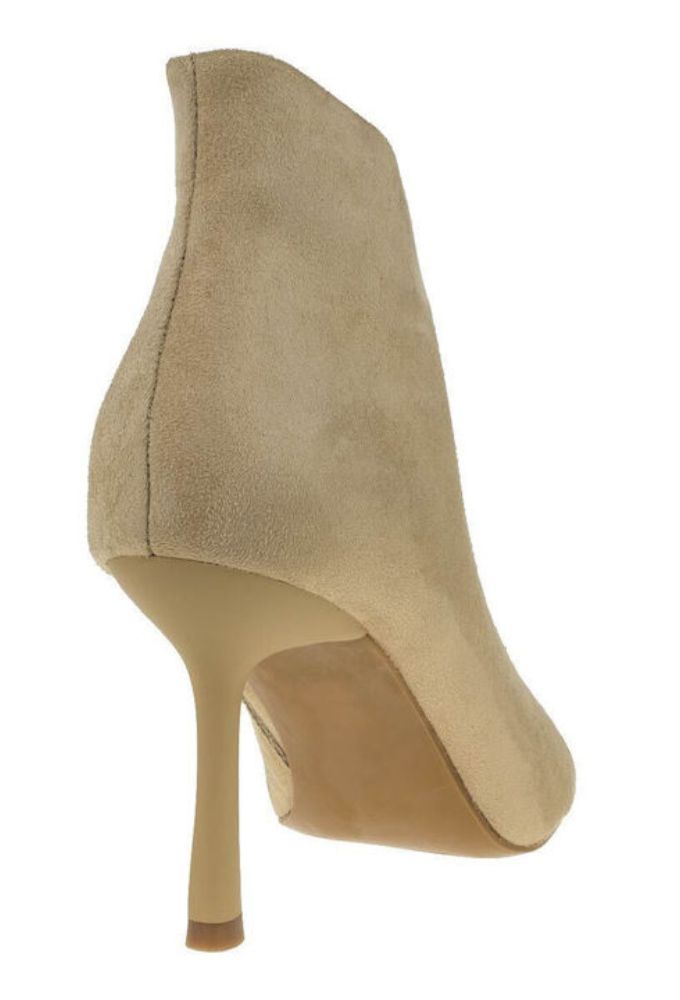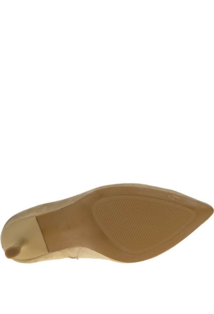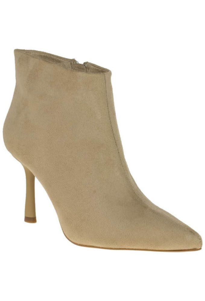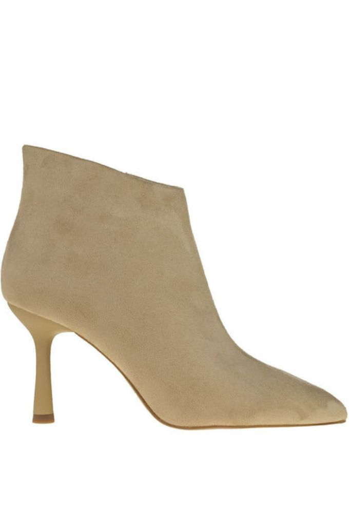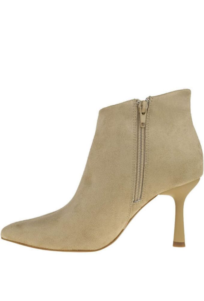 Mποτάκι σουέτ, μπεζ με ψηλό τακούνι, ύψος τακουνιού 8,5cm, μύτη μπροστά, κλείσιμο με φερμουάρ.