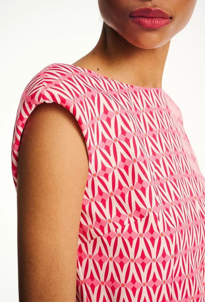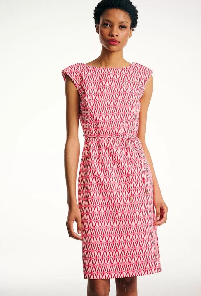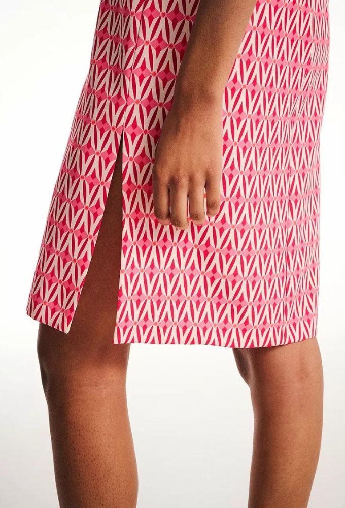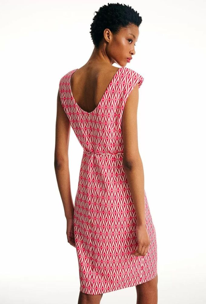 Φόρεμα εμπριμέ midi με βάτες και άνοιγμα στο πλάι. Λεπτομέρεια, λεπτό ζωνάκι απο το ίδιο ύφασμα, χρώμα καρπουζί.