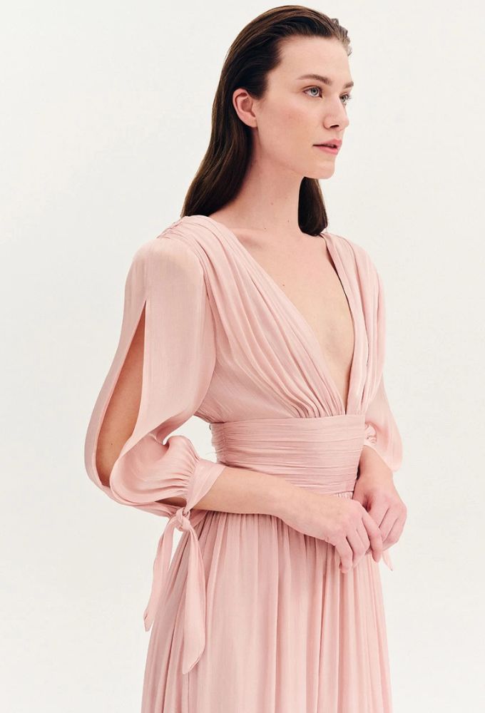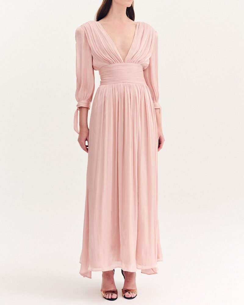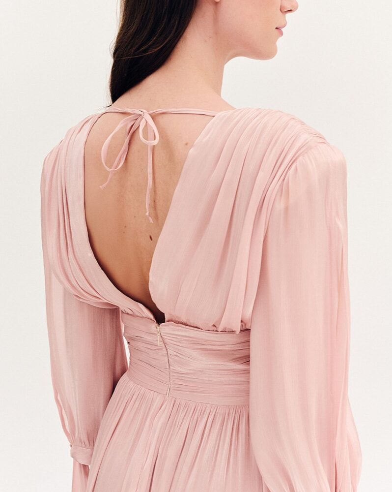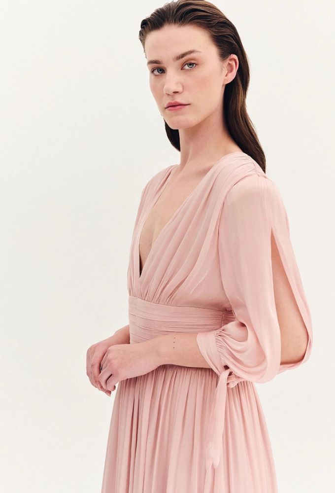 Φόρεμα satin μακρύ με στενή μέση. Μπούστο και πλάτη σε σχήμα V. Μακρύ μανίκι με άνοιγμα και δέσιμο. Λεπτομέρεια, σούρες στο μπούστο και στην μέση. Κλείσιμο με φερμουάρ στο πίσω μέρος.
