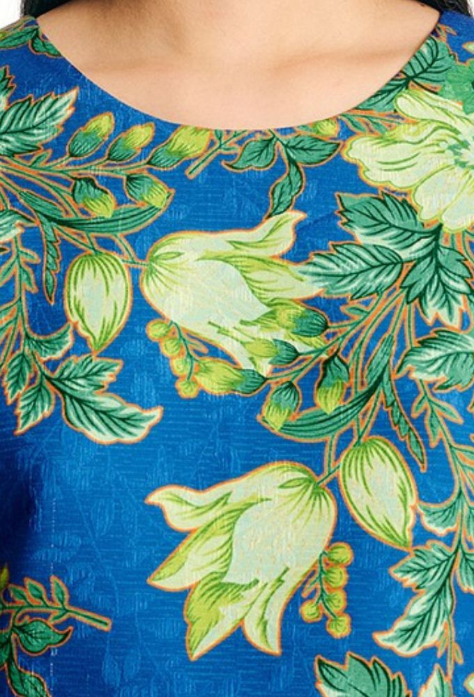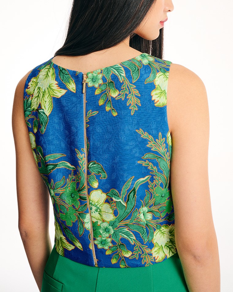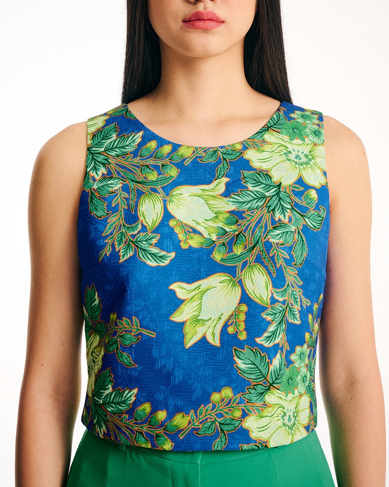 Μπλούζα γυναικεία αμάνικη με λαιμόκοψη, αμπιγιέ με φερμουάρ στο πίσω μέρος, εμπριμέ μπλέ με πράσινο.