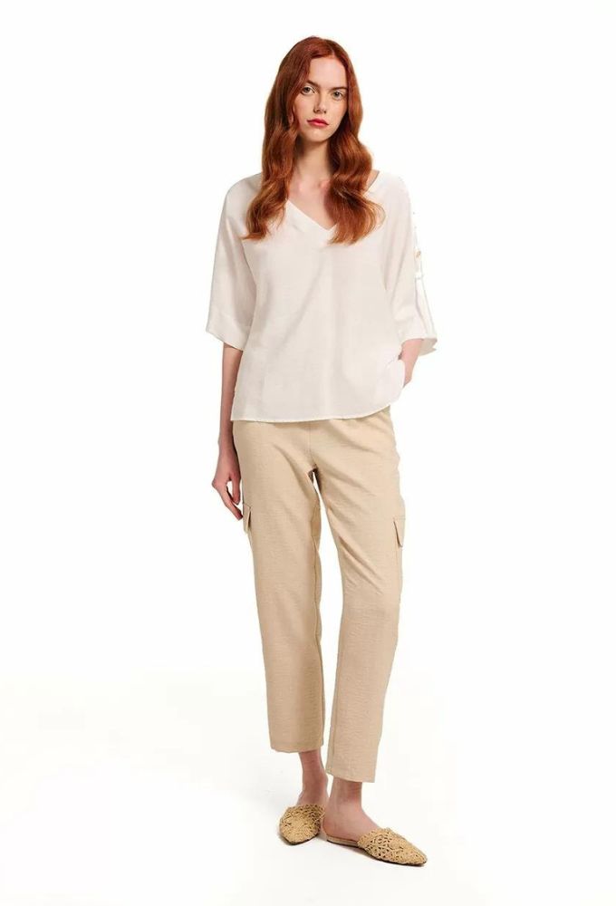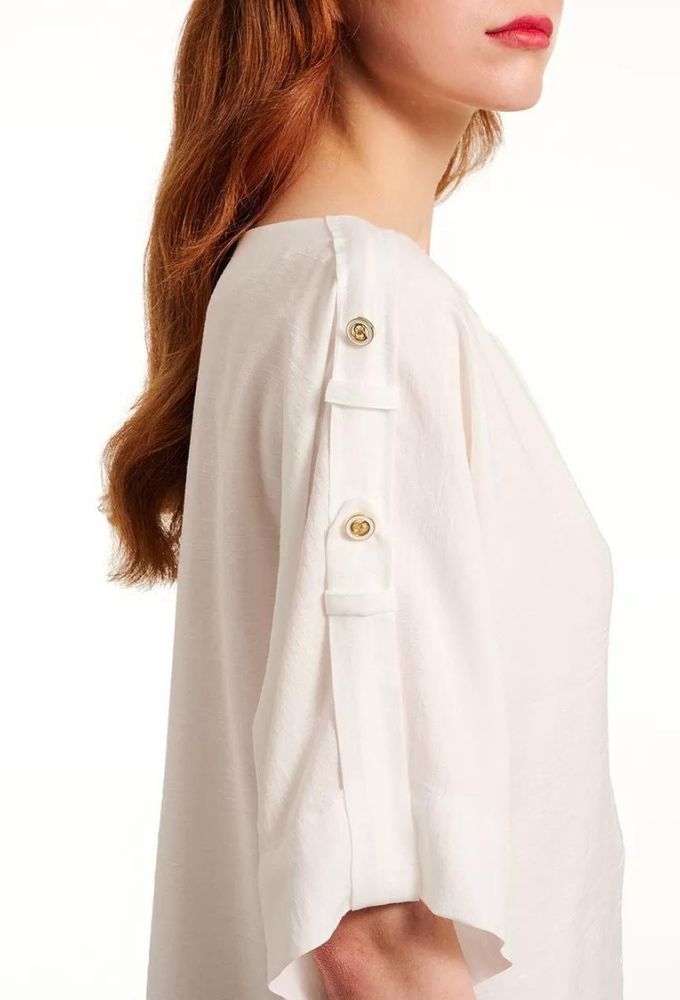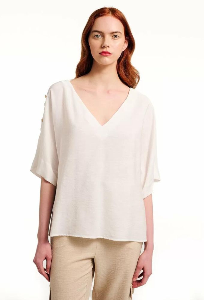 Μπλούζα με ντεκολτέ “V” και ρεγκλάν μανίκι σε άνετη γραμμή. Λεπτομέρεια, επωμίδες από το ίδιο ύφασμα και διακοσμητικά κουμπιά, χρώμα άσπρο.
