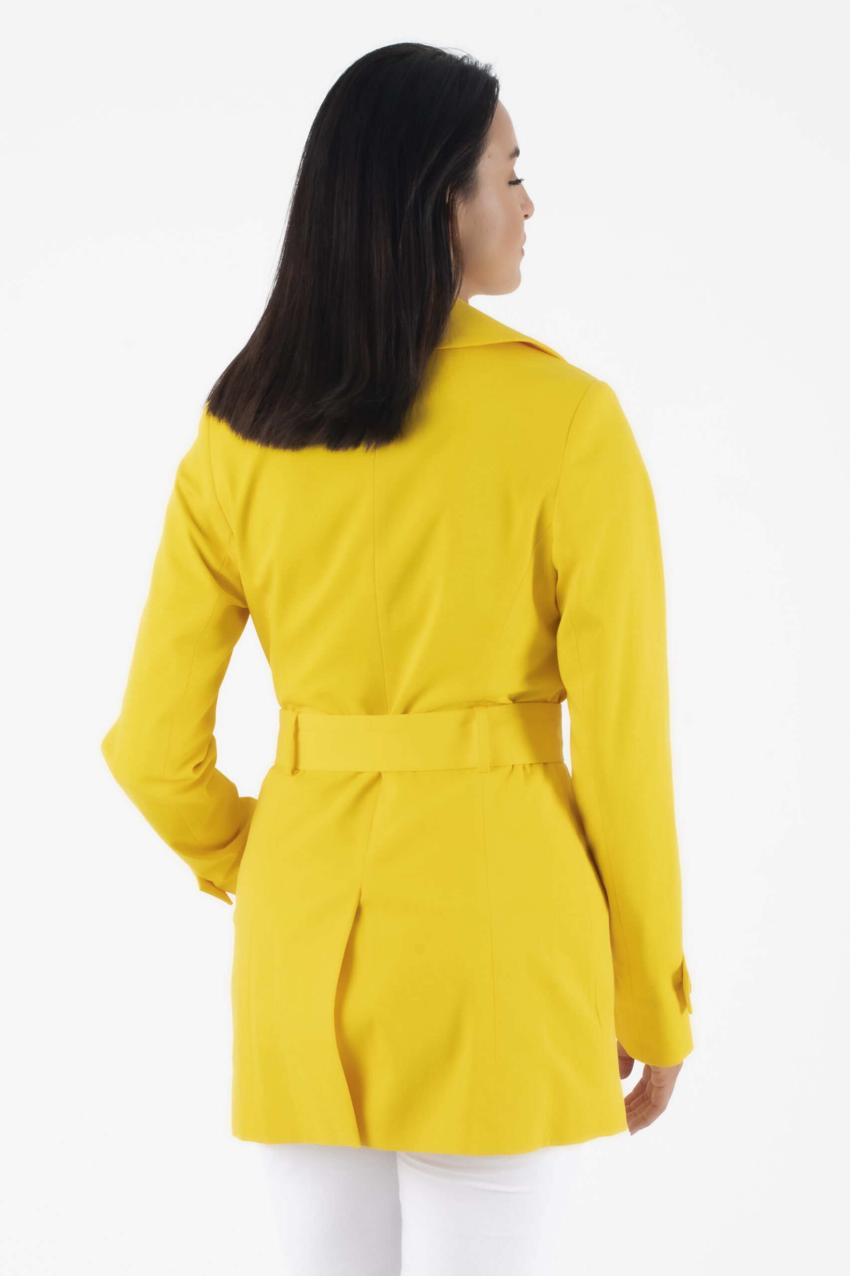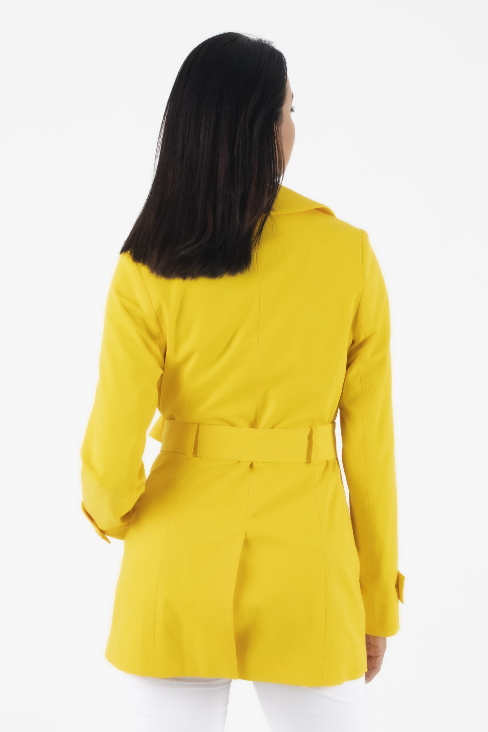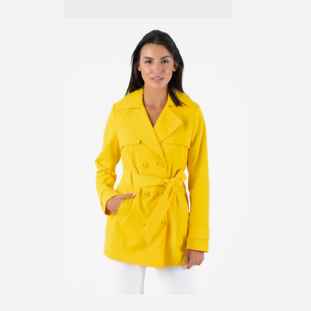 Κίτρινη κοντή καπαρντίνα με εσωτερική μπλε φόδρα , κουμπιά και υφασμάτινη ζώνη.