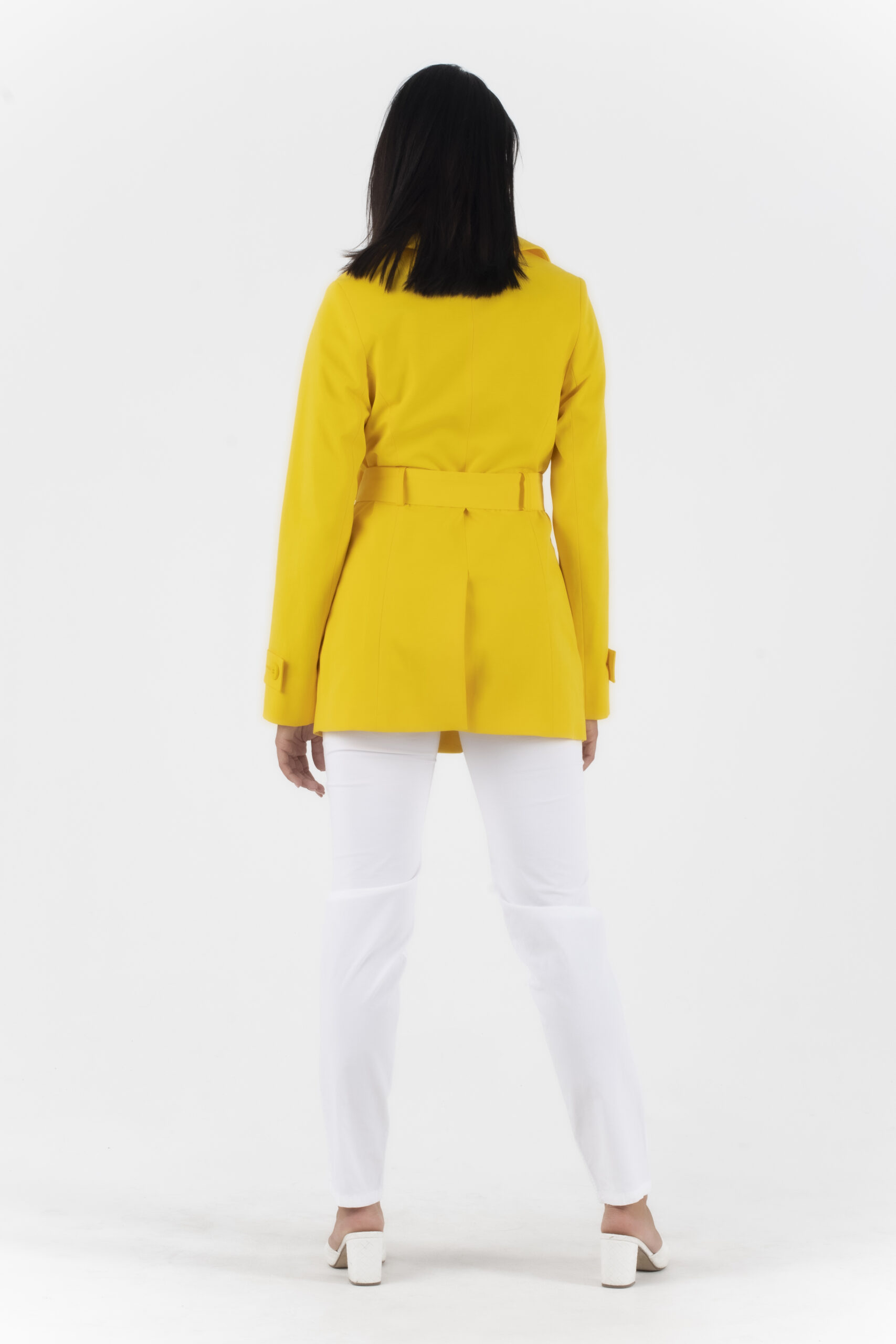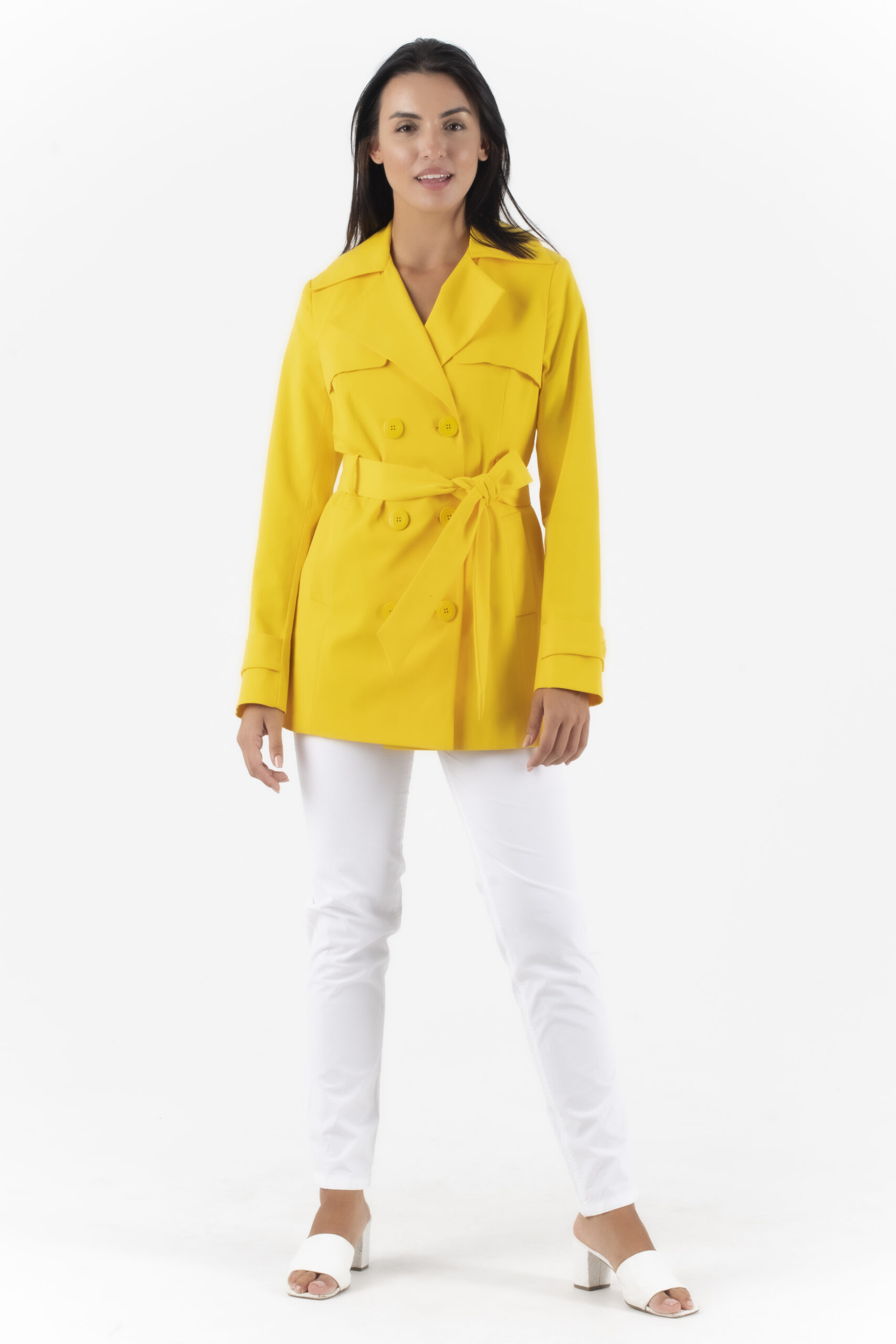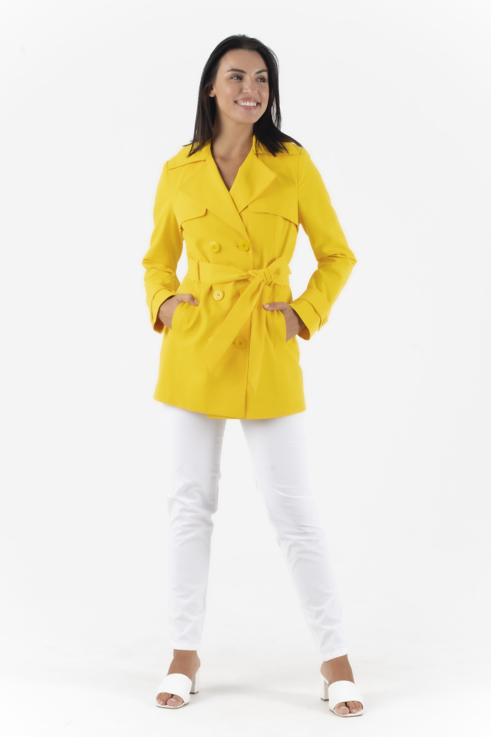 Κίτρινη κοντή καπαρντίνα με εσωτερική μπλε φόδρα , κουμπιά και υφασμάτινη ζώνη.