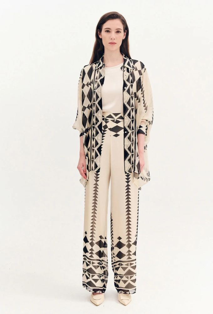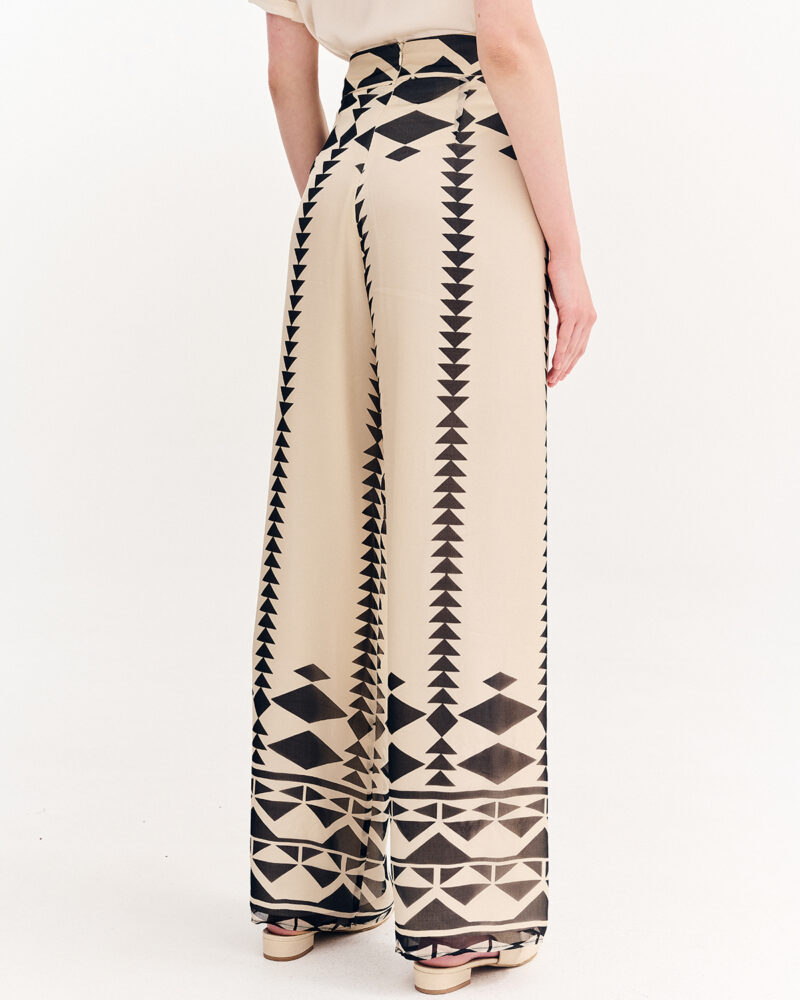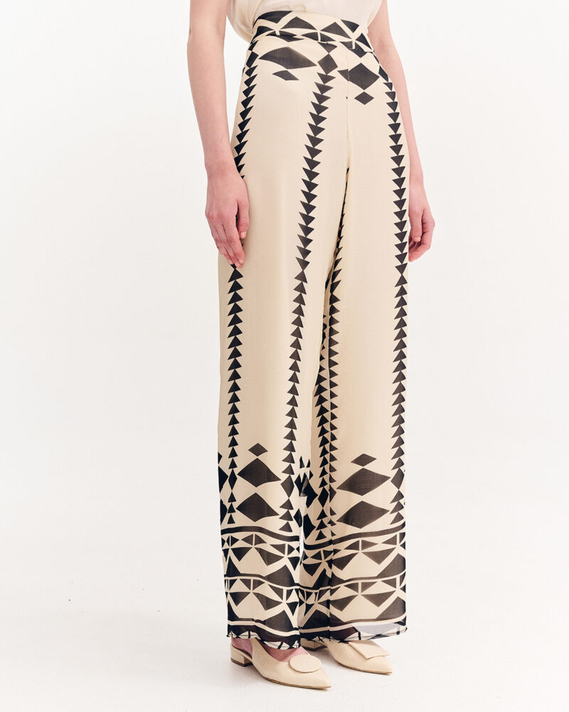Παντελόνι με γεωμετρικά σχέδια με μείγμα από μεταξωτό ύφασμα. Φαρδύ μπατσάκι και λάστιχο στην μέση.