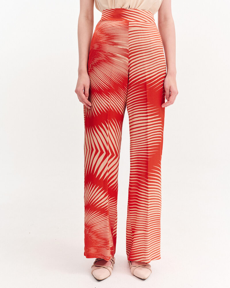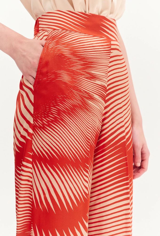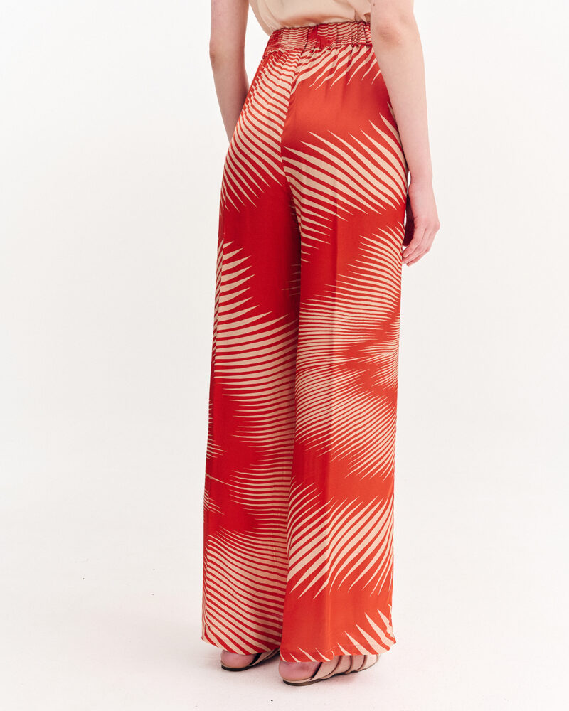 Παντελόνι σε εμπριμέ μοτίβο από βισκόζ ύφασμα. Φαρδύ μπατζάκι και κοφτές τσέπες πάνω στην ραφή. Ελαστική μέση στο πίσω μέρος.