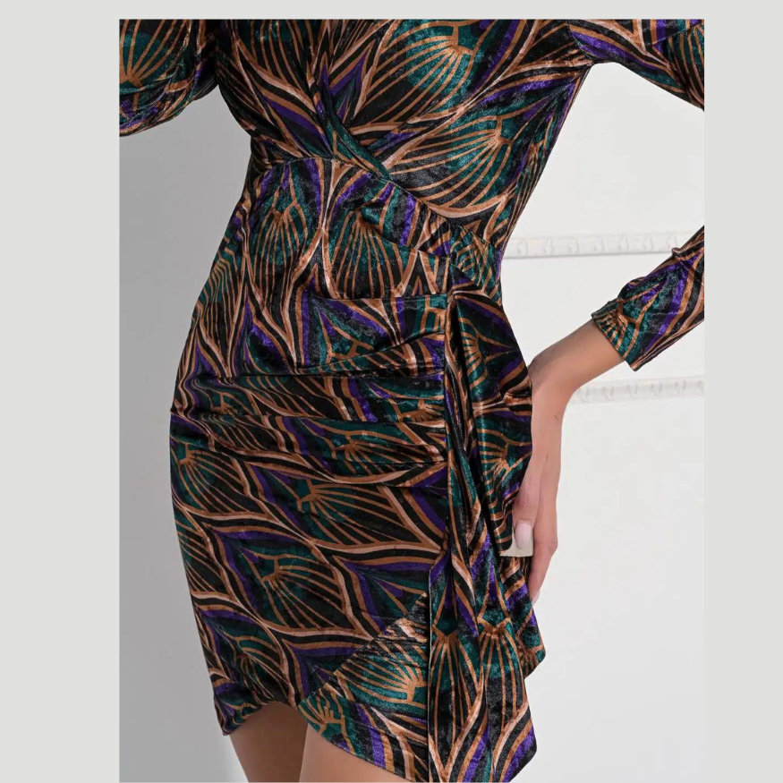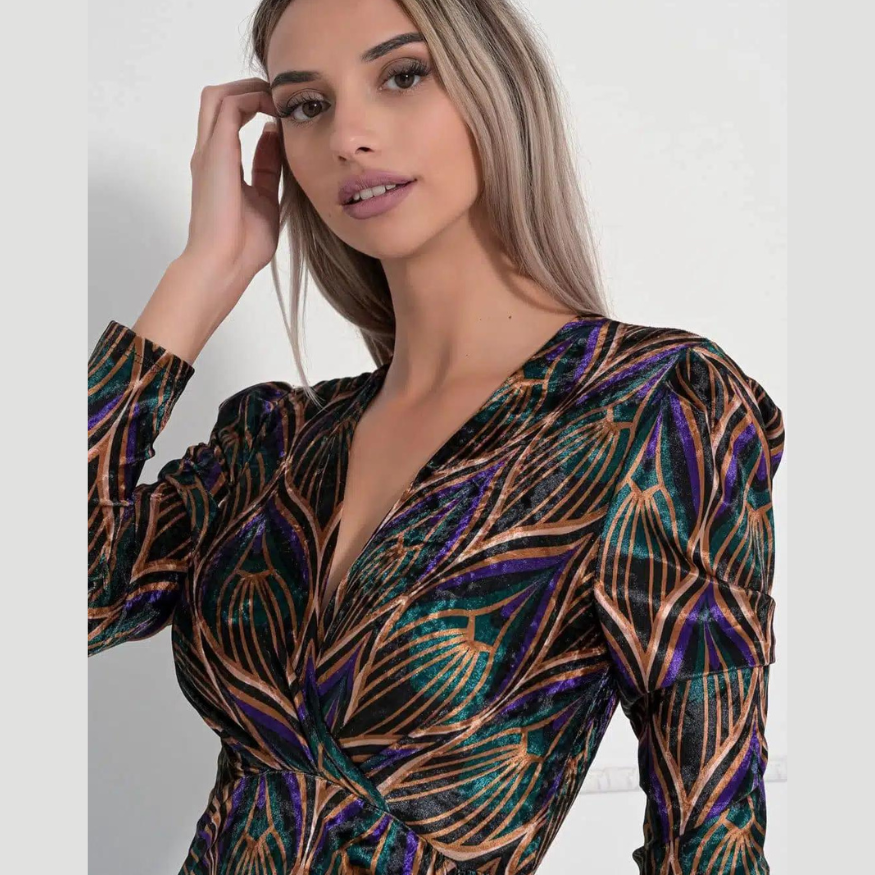 Μίνι βελούδινο φόρεμα με έντονο εμπριμέ μοτίβο. Κρουαζέ πάνω μέρος με ενσωματωμένα cups στο ντεκολτέ. Μανίκι μακρύ με πιέτες στους ώμους που δημιουργούν όγκο. Λάστιχο στη μέση. Σχέδιο με πλαινά πιασίματα και έξτρα ριχτή φάσα στο κάτω μέρος. Σύνθεση : 92% POLYESTER 8%ELASTANE