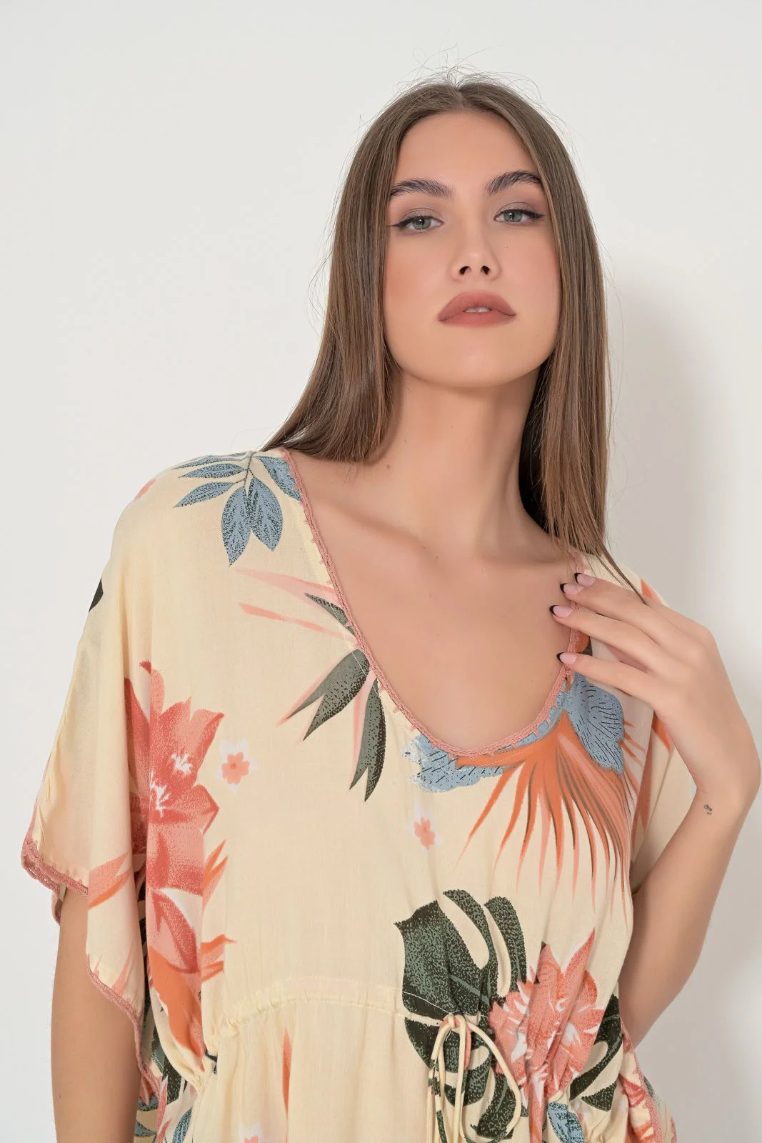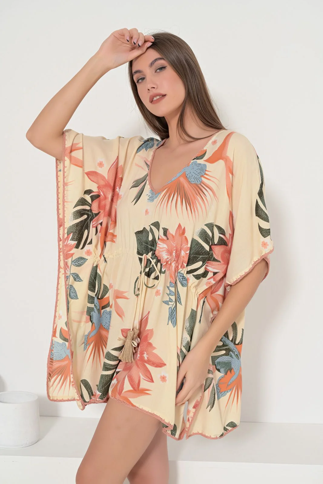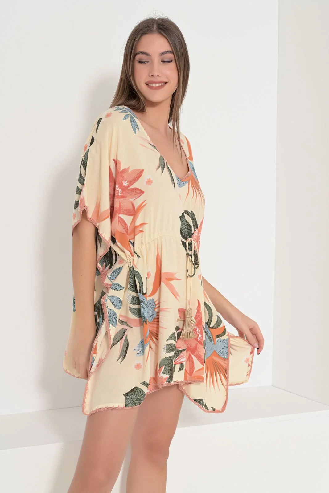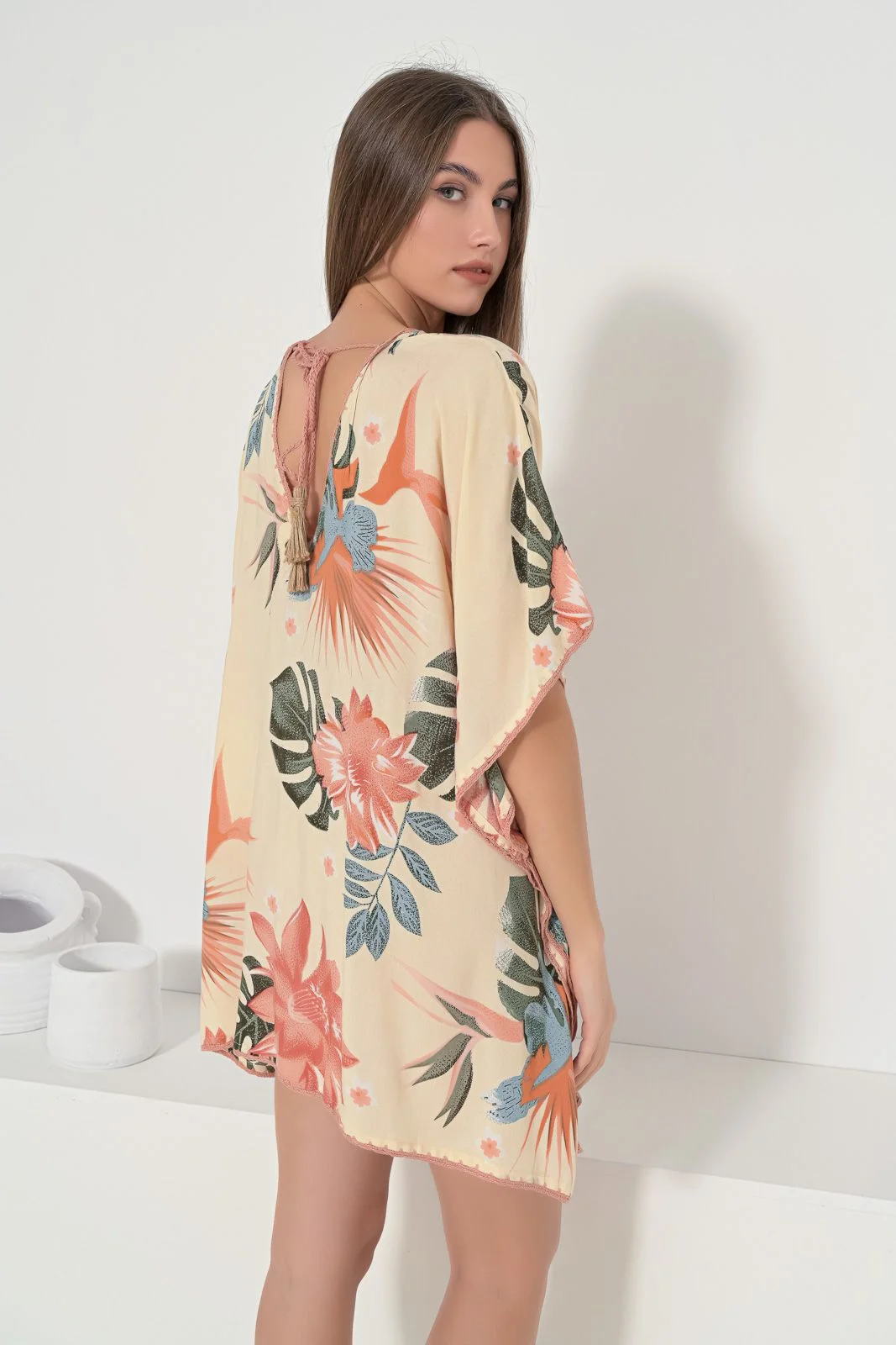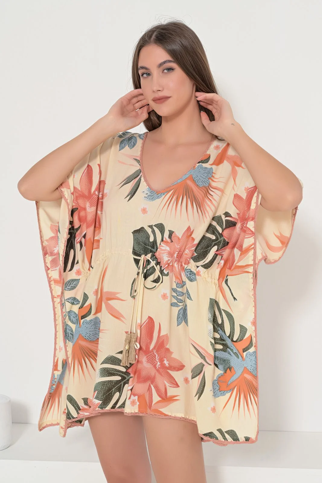 Καφτάνι κοντό με μεγάλο φλοράλ μοτίβο. Ανοιχτό ντεκολτέ με πλεκτό φινίρισμα. Πλάτη με V άνοιγμα και δετό κορδόνι. Μέση με ρυθμιζόμενο κορδόνι με tassel και κοχύλια. Ίσια γραμμή με πλαινά ανοίγματα. Σύνθεση : 100% VISCOSE, χρώμα πορτοκαλί.