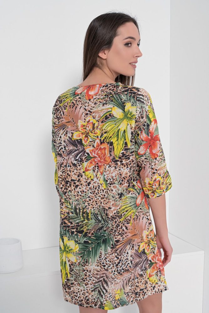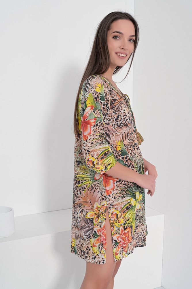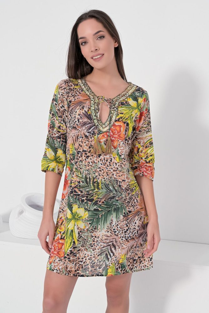 Καφτάνι με άνιμαλ μοτίβο. Ανοιχτή λαιμόκοψη με κορδόνι και παγιέτα. Μανίκι 3/4. Κάτω μέρος με πλαϊνά ανοίγματα, χρώμα καφέ. Σύνθεση : 100% COTTON