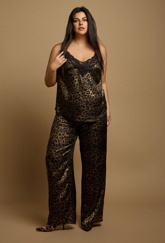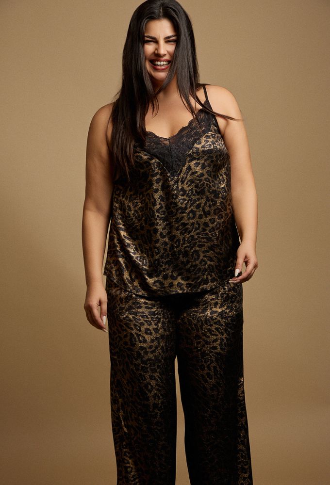 Plus size, τοπ τιραντάκι, με δαντέλα και ρυθμιζόμενες τιράντες, animal print, χρώμα μαύρο/χρυσό.