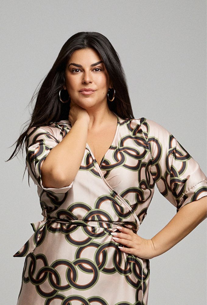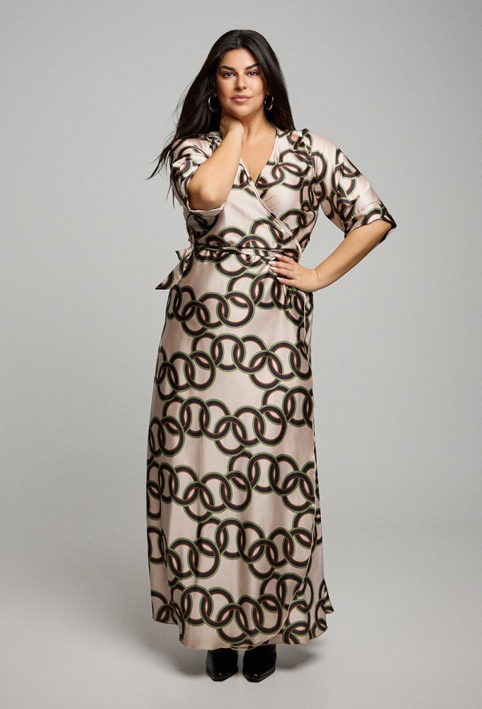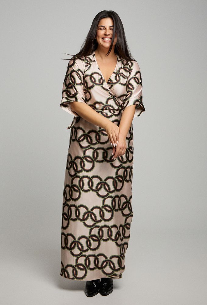 Γυναικείο plus size φόρεμα maxi εμπριμέ, κρουαζέ, τύπου σατέν.