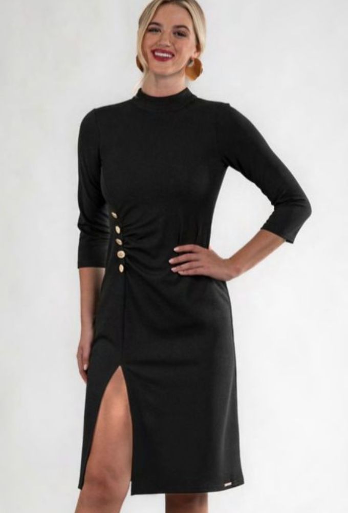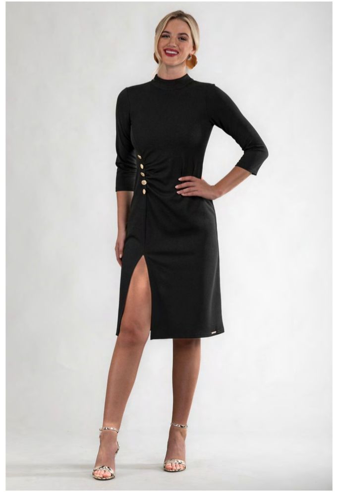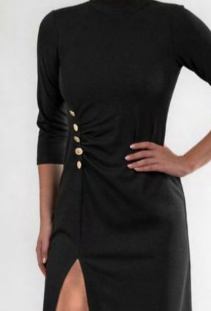 Φόρεμα midi, λαιμόκοψη, άνοιγμα μπροστά, με 3/4 μανίκι και λεπτομέρεια με χρυσά κουμπιά.