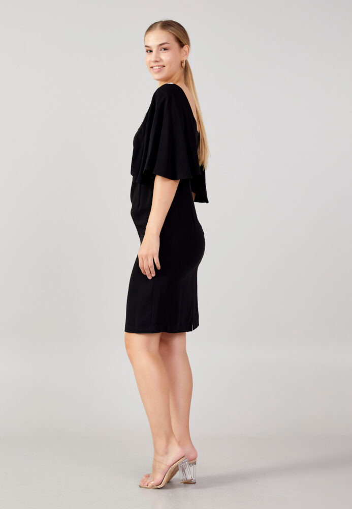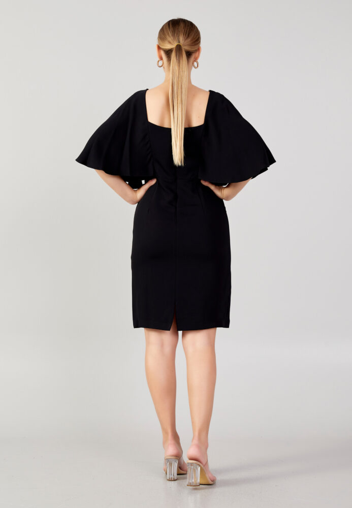 Μαύρο Κοντομάνικο Midi Cocktail Φόρεμα με V