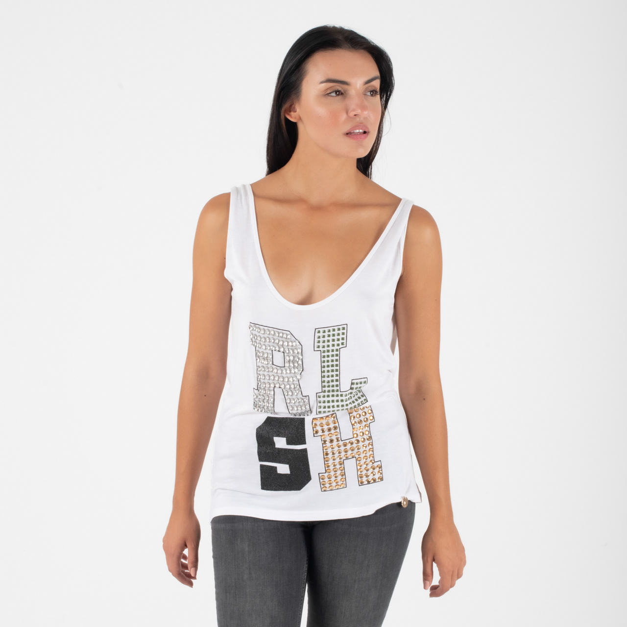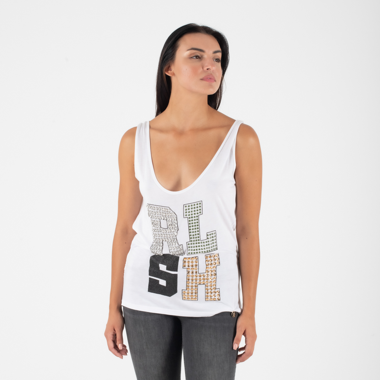 Relish βαμβακερή μπλούζα με ελαστικότητα, αμάνικη με γράμματα και στρας στο μπροστινό μέρος .
