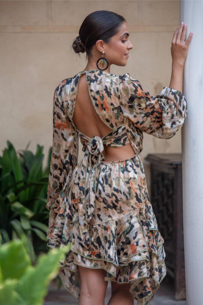 Sunset and Moon Λεόπαρ Mini Φόρεμα με βολάν και ανοιχτή πλάτη