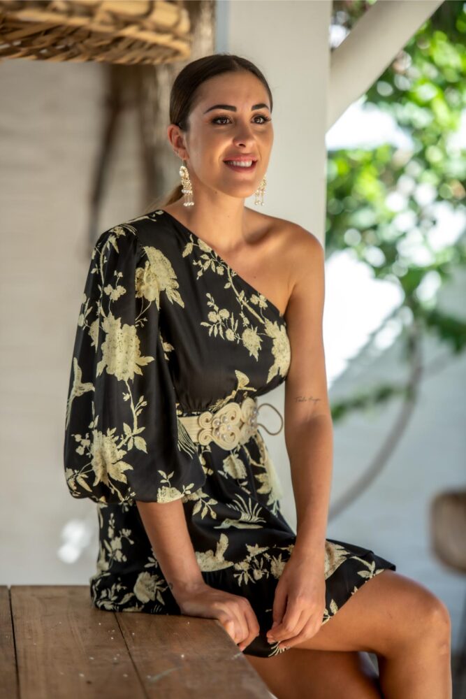 Sunset and Moon Μαύρο Mini Φόρεμα με μπεζ print και ένα μανίκι