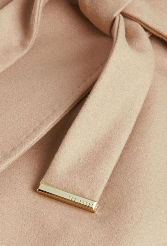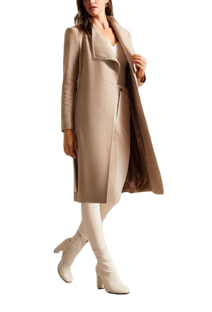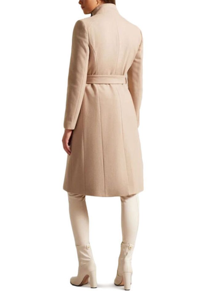 Ted Baker  μάλλινο παλτό μέχρι το γόνατο, με ζώνη στη μέση και με εσωτερική εμπριμέ φόδρα.