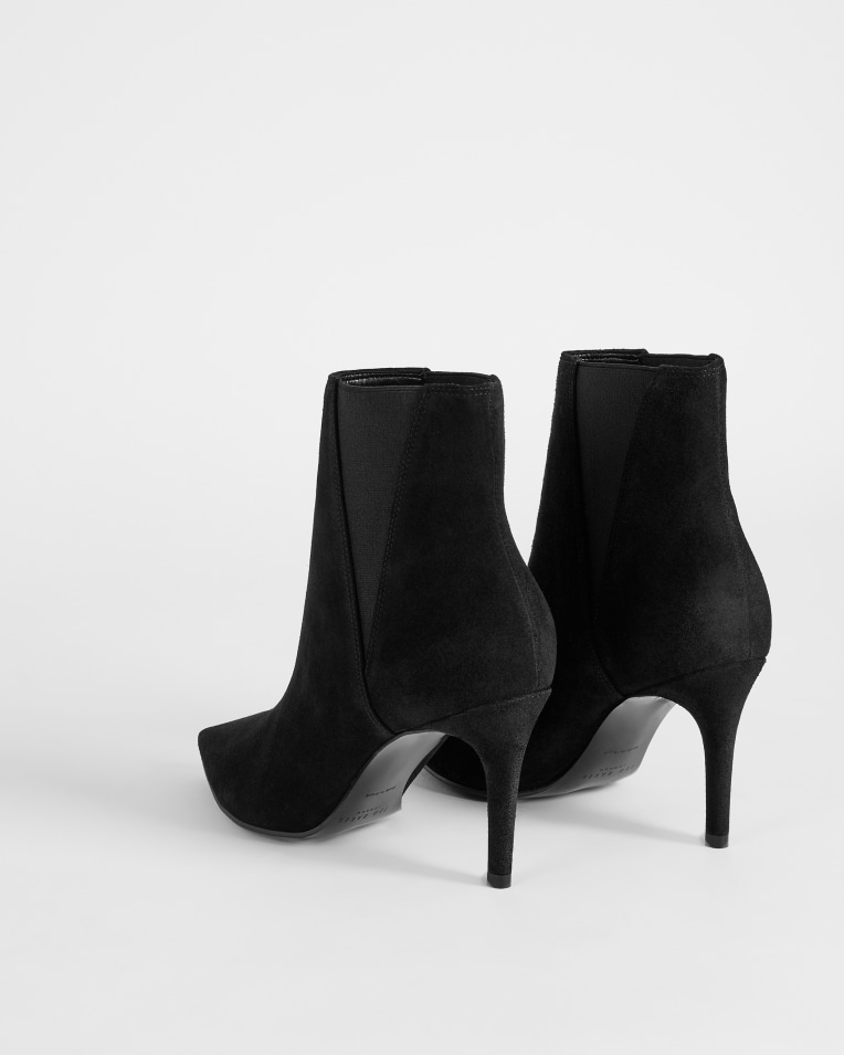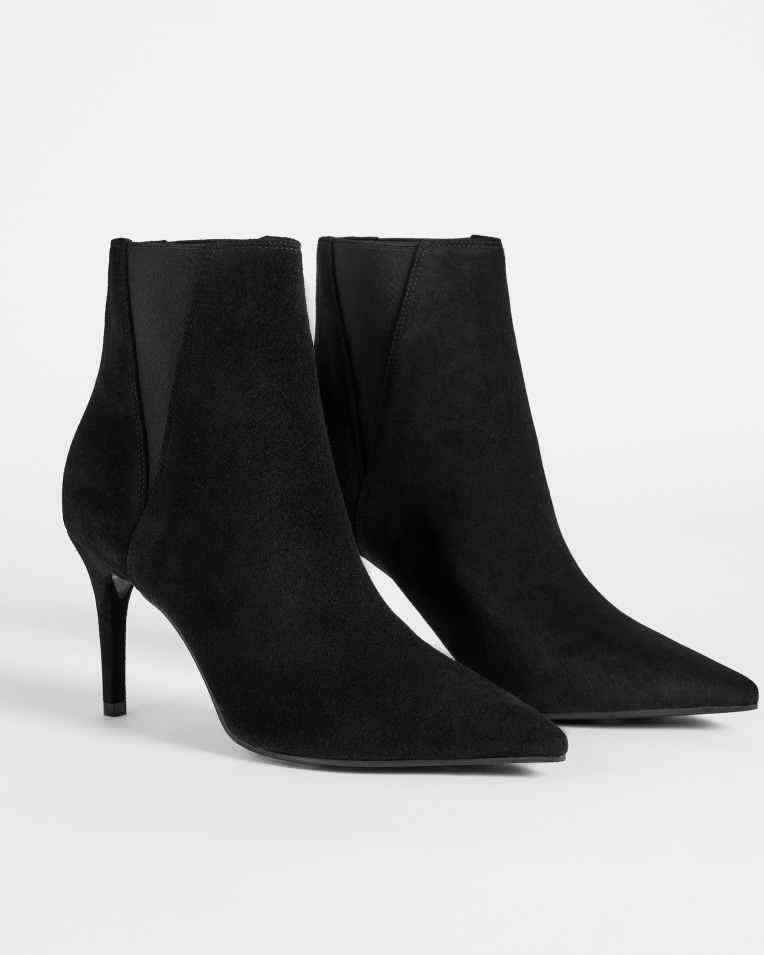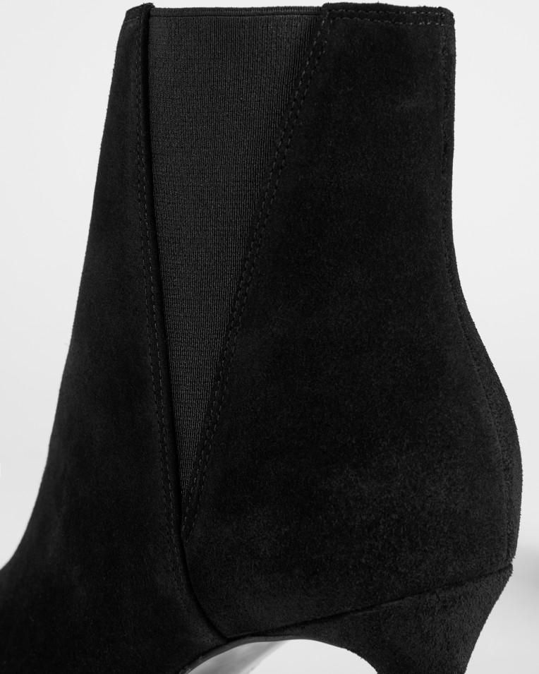 Μαύρα σουέτ μποτάκια μυτερά μπροστά, με λεπτό άνετο τακούνι και λάστιχο στο πλάι για άνετη εφαρμογή.
