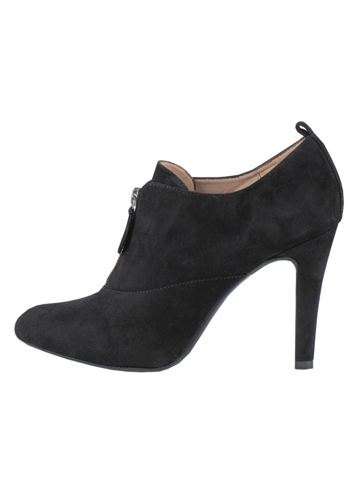 Μποτάκια καστόρινα με ψηλό τακούνι και λεπτομέρεια με φερμουάρ στο μπροστινό μέρος, ύψος τακουνιού 10 εκατοστά, χρώμα μαύρο.